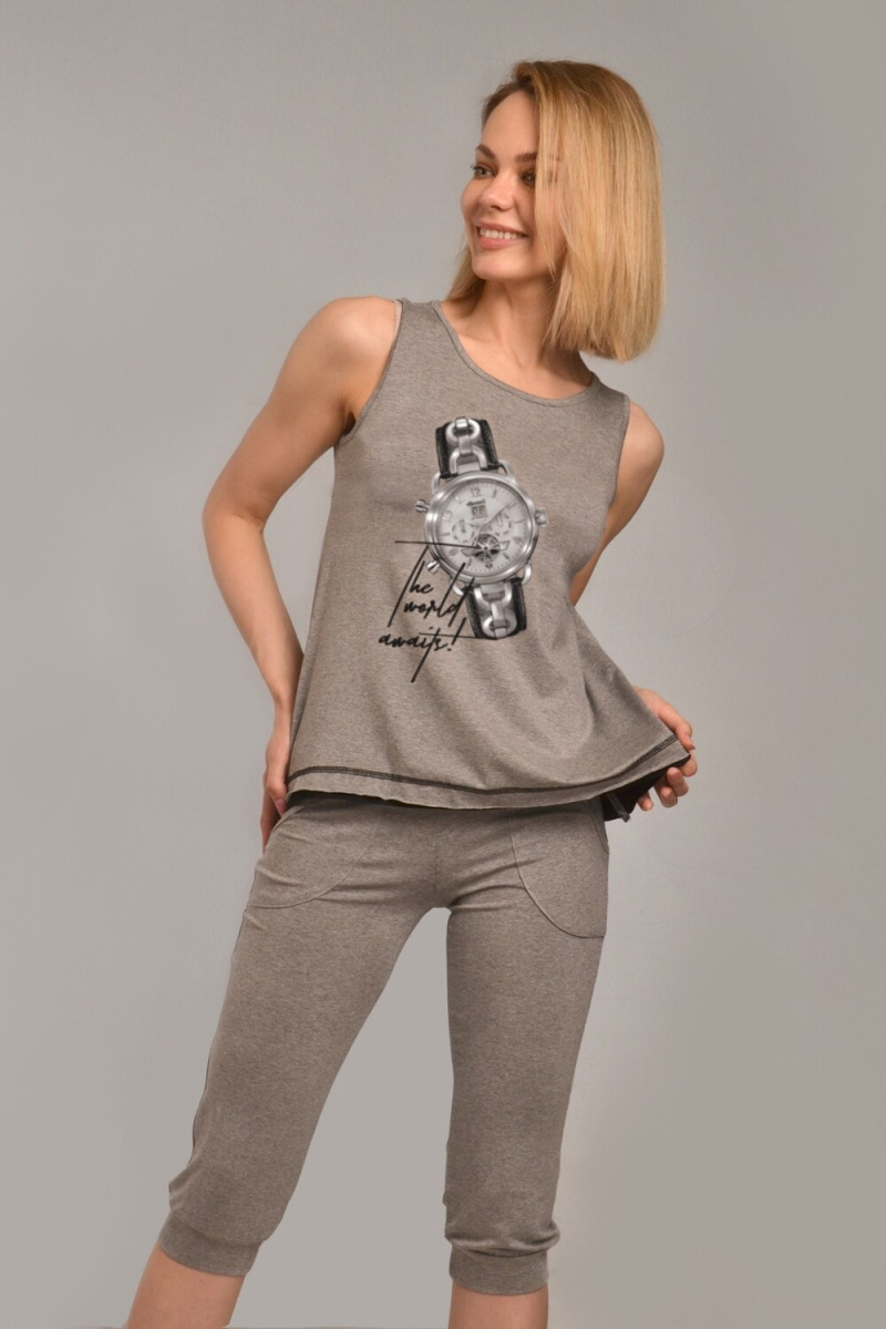 Стильный вискозный комплект с оригинальным печатным рисунком на майке трапециевидного силуэта, низ обработан контрастной полосой. Бриджи на притачном поясе с регулировкой на кулисе, низ на манжете.