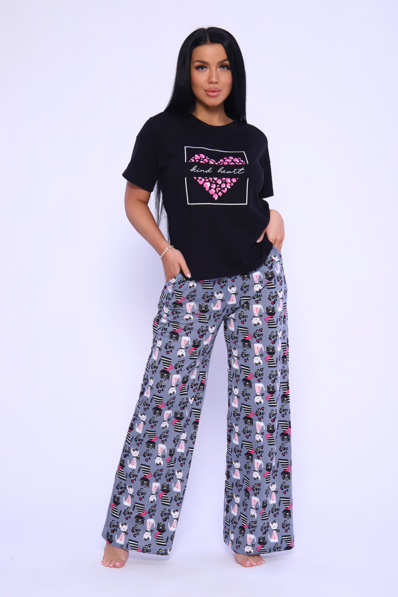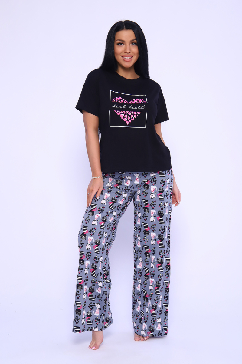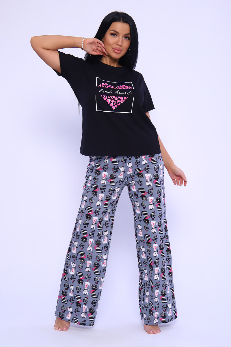Женский домашний костюм-пижама, состоящий из футболки и брюк Кошки из трикотажного полотна 100% хлопка. Приятный дышащий материал идеален для изготовления домашней одежды. Футболка свободного кроя, с круглой горловиной и втачным спущенным коротким рукавом, в которой будет одинаково приятно спать и заниматься домашними делами. Оригинальный, яркий принт обязательно поднимет настроение. Брюки прямого силуэта свободного кроя, с карманами в боковых швах. Мягкий удобный пояс на резинке не перекрутится, т.к отстрочен на поясной машине. Пижамка не изменит свой внешний вид после стирки при соблюдении рекомендаций по уходу и будет долго вас радовать. Отличный подарок для всех девушек и женщин на любой праздник!