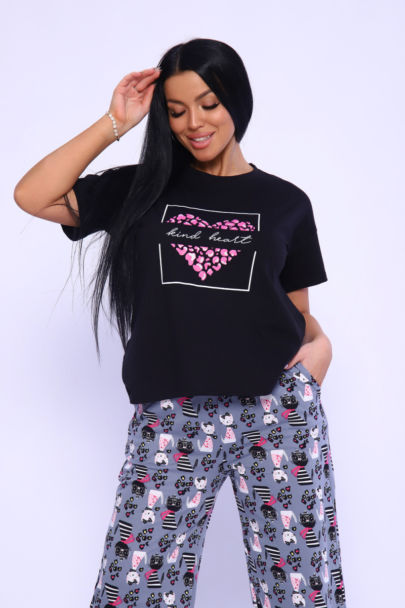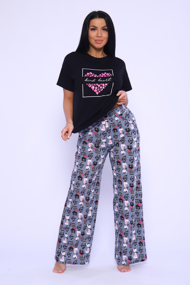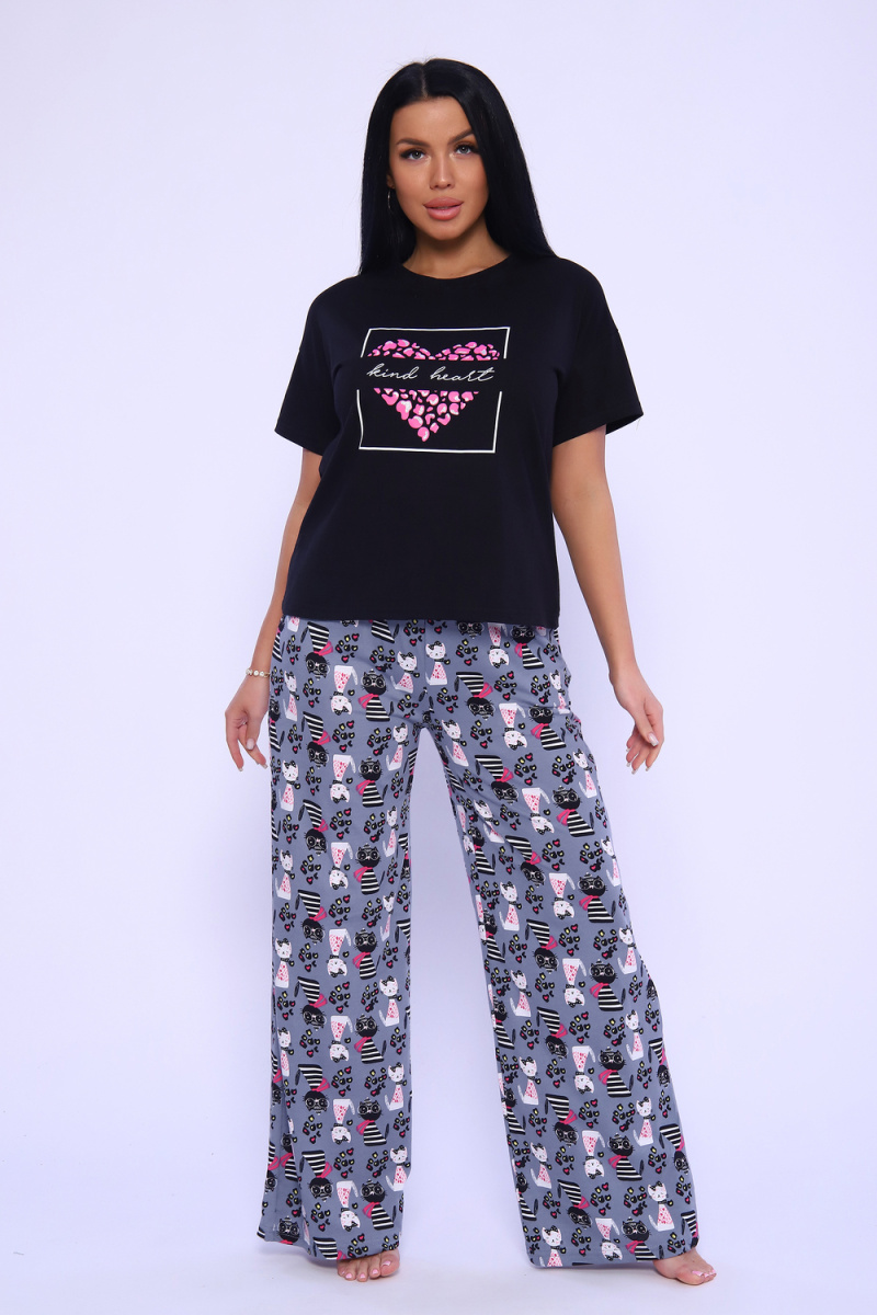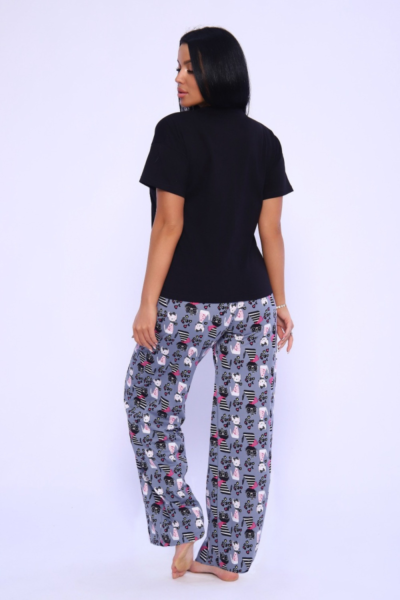 Женский домашний костюм-пижама, состоящий из футболки и брюк Кошки из трикотажного полотна 100% хлопка. Приятный дышащий материал идеален для изготовления домашней одежды. Футболка свободного кроя, с круглой горловиной и втачным спущенным коротким рукавом, в которой будет одинаково приятно спать и заниматься домашними делами. Оригинальный, яркий принт обязательно поднимет настроение. Брюки прямого силуэта свободного кроя, с карманами в боковых швах. Мягкий удобный пояс на резинке не перекрутится, т.к отстрочен на поясной машине. Пижамка не изменит свой внешний вид после стирки при соблюдении рекомендаций по уходу и будет долго вас радовать. Отличный подарок для всех девушек и женщин на любой праздник!